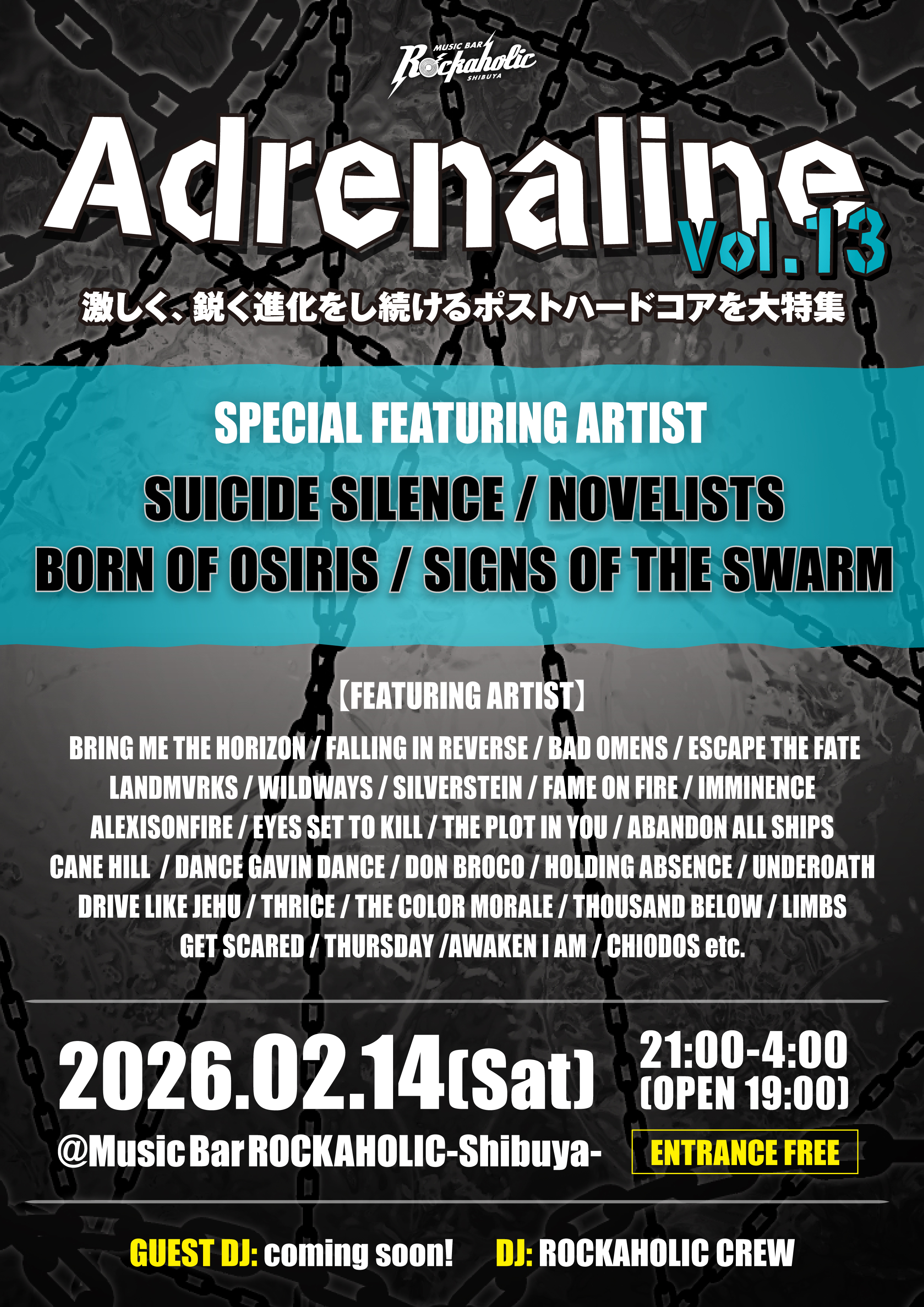 1980年代から最新曲まで進化をし続けるポストハードコアをパワープレイするイベント"Adrenaline Vol.13"の開催が2月14日(土)に決定した!